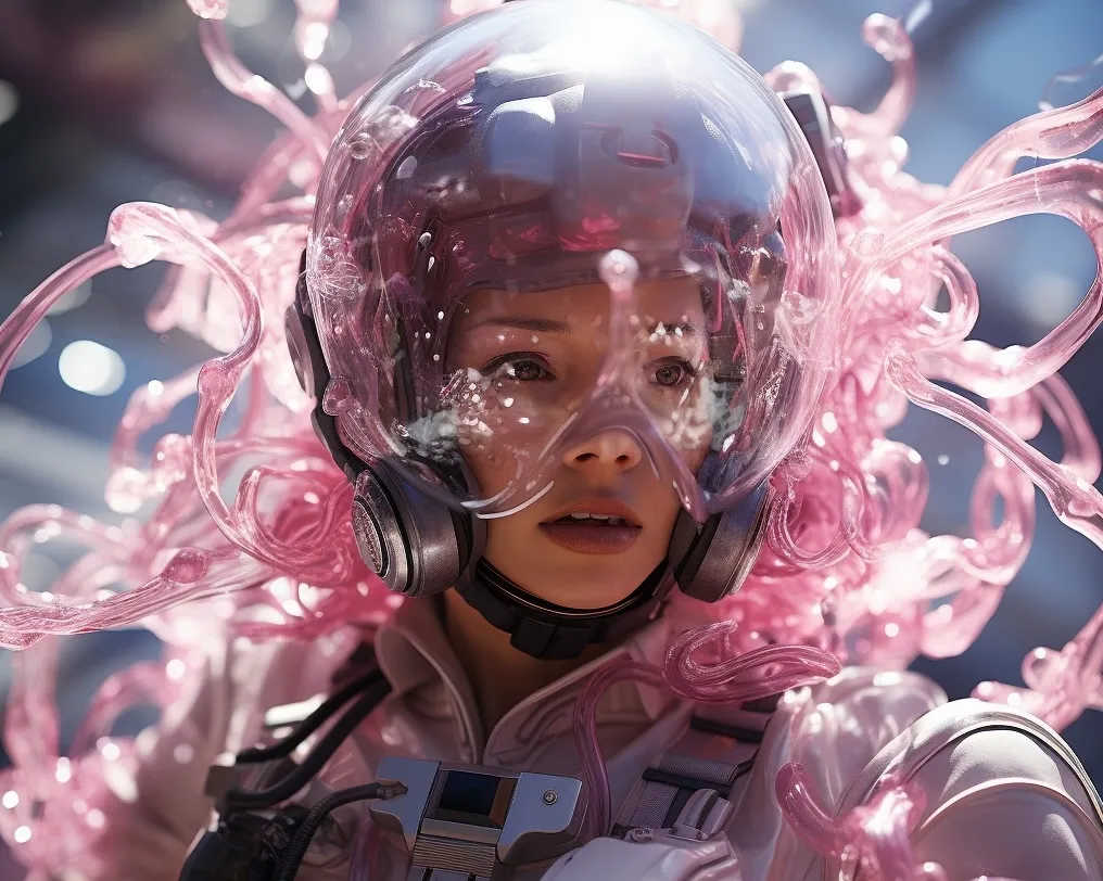 Photo of xenomorph alien interstellar bold move; working class empathy; androgynous Barbie as a robot version in a blockbustermovie, pastel, plastic, pink, color bright, sunshine, into the light. Highly detailed textures, action scene with explosion, 8k resolution, Hasselblad 250 megapixel camera photo, hard focus and soft focus, bokeh, (movie poster with different movie characters in poster) natural palette; neutral colors; cinegraphic; wideangel lense; soft edges; curves; bokeh; anamorph lense